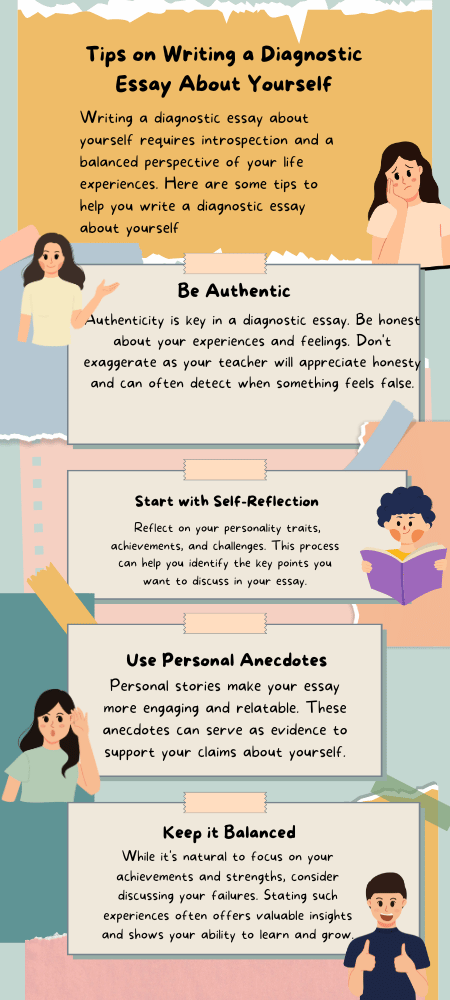 Writing a diagnostic essay about yourself requires introspection and a balanced perspective of your life experiences. Here are some tips to help you write a diagnostic essay about yourself;